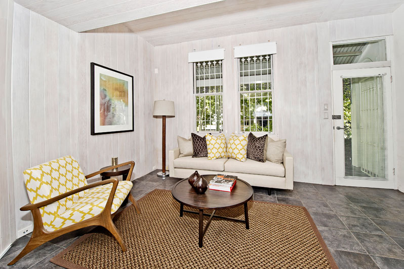 - Versatile study or library, limewashed cedar paneling