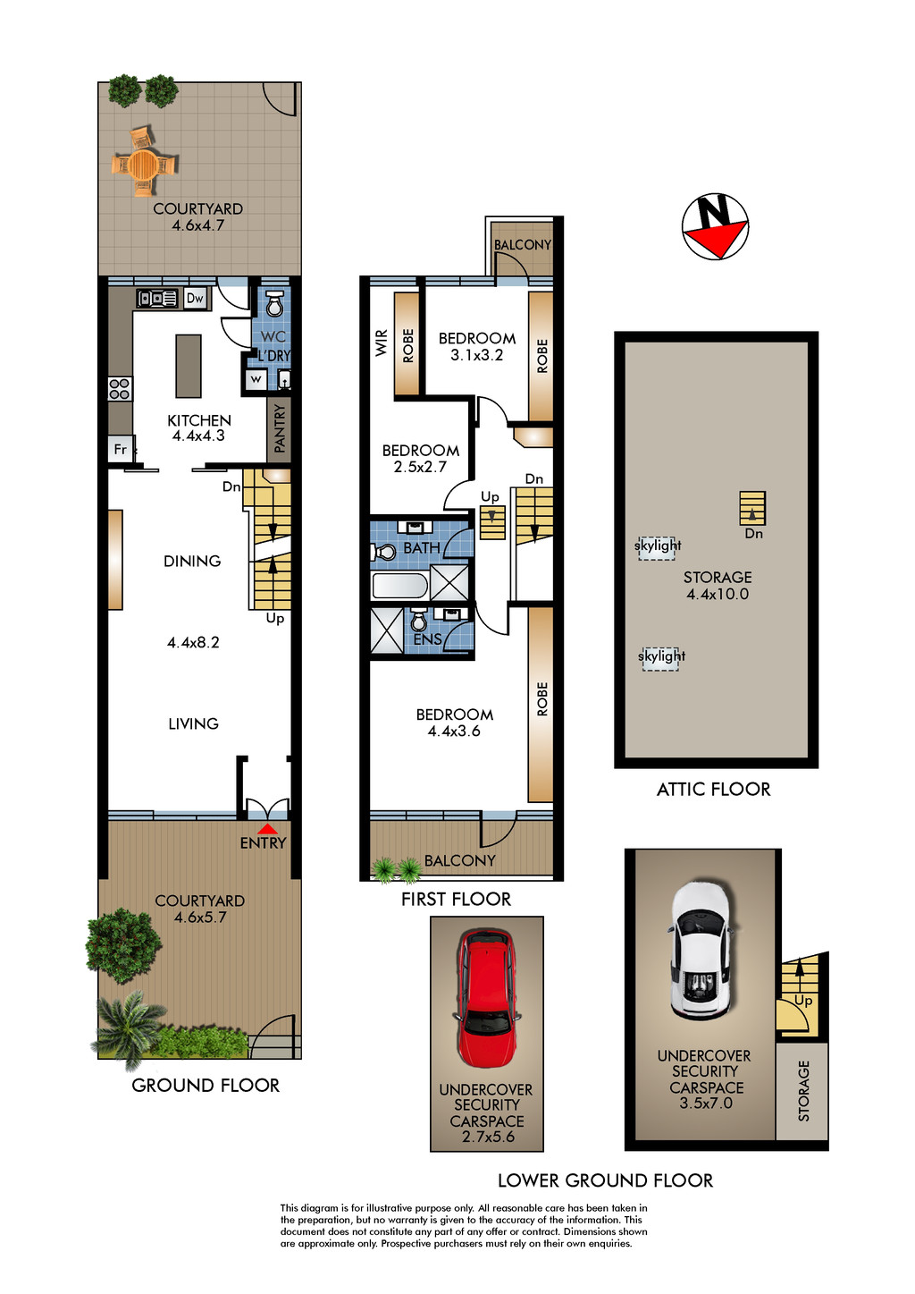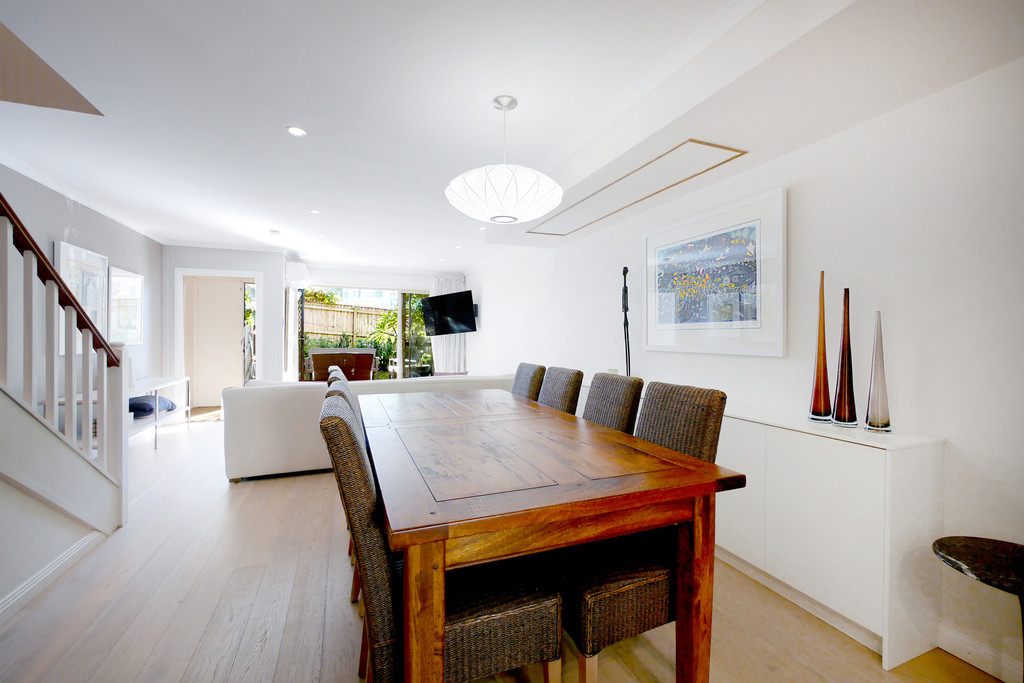 Opening from private street access to a sunny courtyard, the home flows to a modern living area with adjoining dining space, which in turn leads to the large kitchen. With stone benches and contemporary styling, this further leads to a sheltered rear courtyard, an ideal BBQ spot, with adjacent WC/laundry. The upper bedroom level is a tranquil zone, the main with en-suite, b/ins and sun-bathed front balcony. The main bathroom and 2 other bedrooms are excellent spaces, while a huge attic storage area adds convenience.