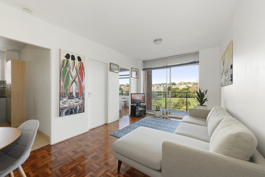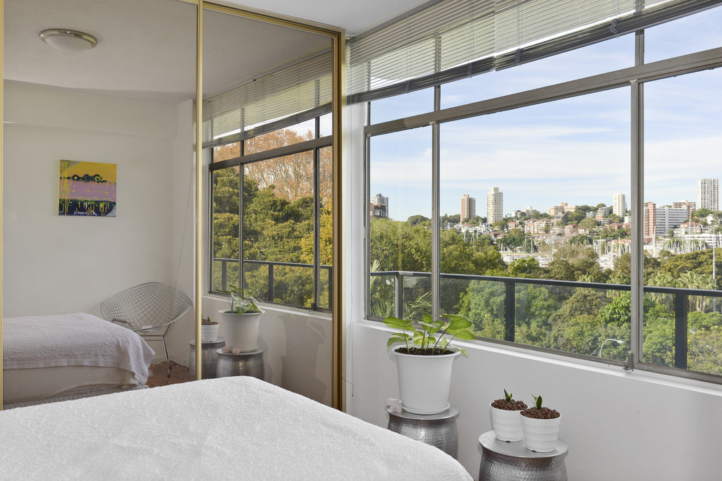 Panoramic 180 uninterrupted views across the leafy environs of harbourside Rushcutters Bay Park and Reg Bartley Oval to Darling Point, the bay and yacht-filled marina of the Cruising Yacht Club are captured from this light-filled apartment in the premier top floor NE corner position of Parkview, a boutique mid-century modern building set at the end of the secure gated driveway.