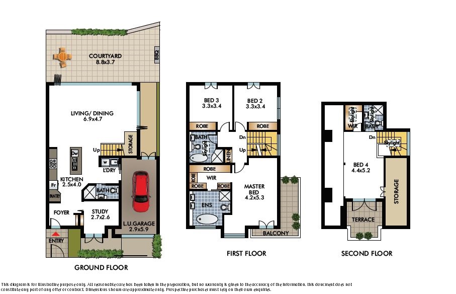Designed for open plan living, and with a large paved courtyard ideal for entertaining, this impressive residence includes oak flooring, a Miele/Caesar stone kitchen, plush bedroom carpeting, ducted air-conditioning and a well-considered palette of colours and textures throughout. All bedrooms include stylish built in wardrobes, with both the master and self-contained top floor retreat enjoying en-suites, walk-in wardrobes and sunny balconies.