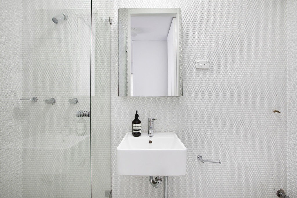 andbull; Designer bathroom featuring penny round mosaic tiles, built-ins