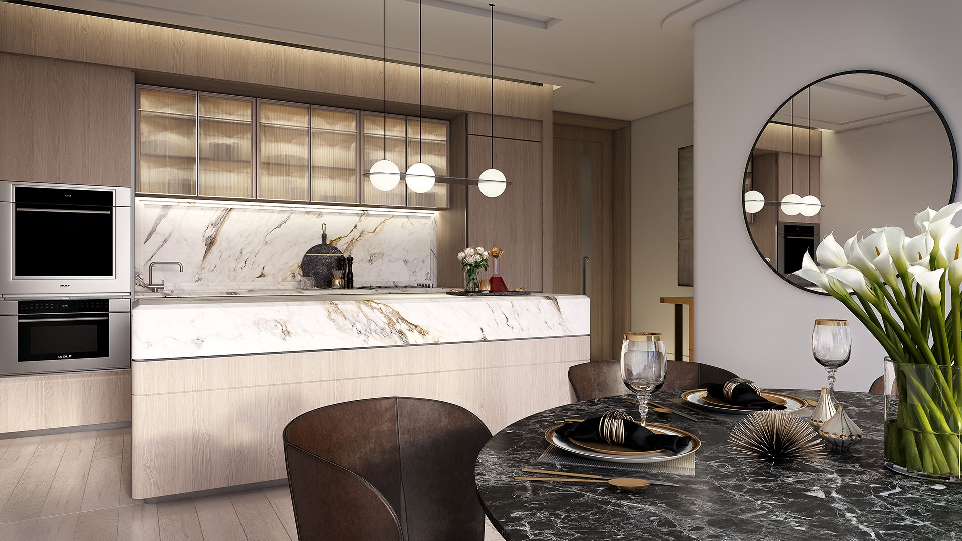 -Lavish kitchen featuring natural stone benchtop and splashback, brand new Miele appliances, soft close draws, concealed lighting and polished chrome