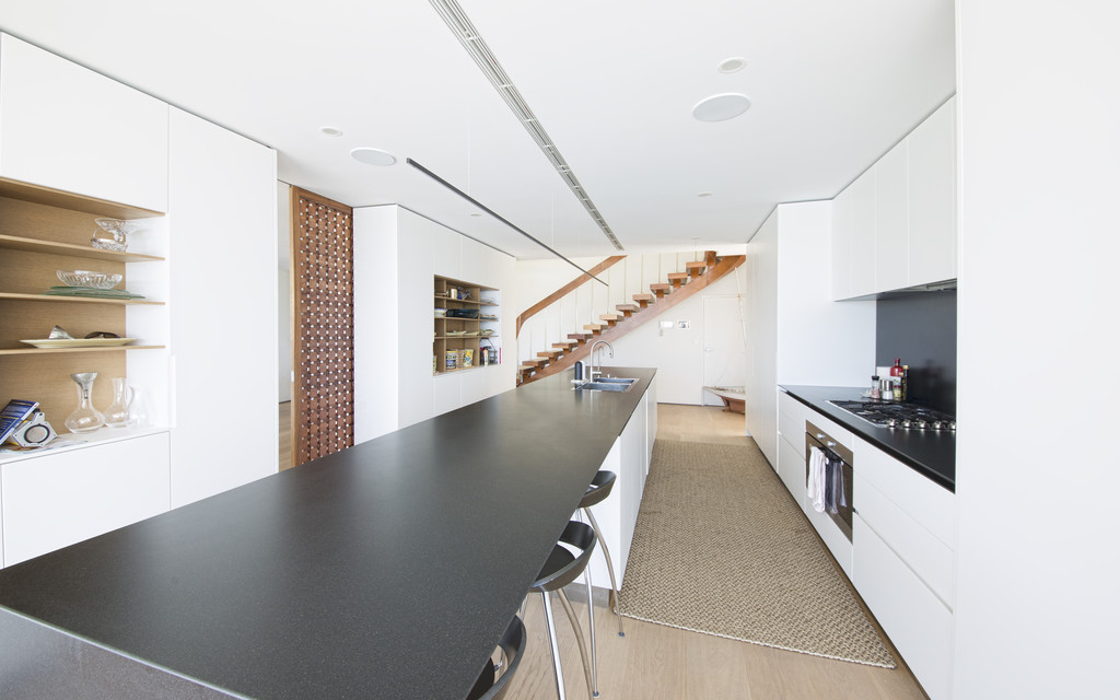 - Streamlined Boffi kitchen with b'fast bench and s/steel appliances