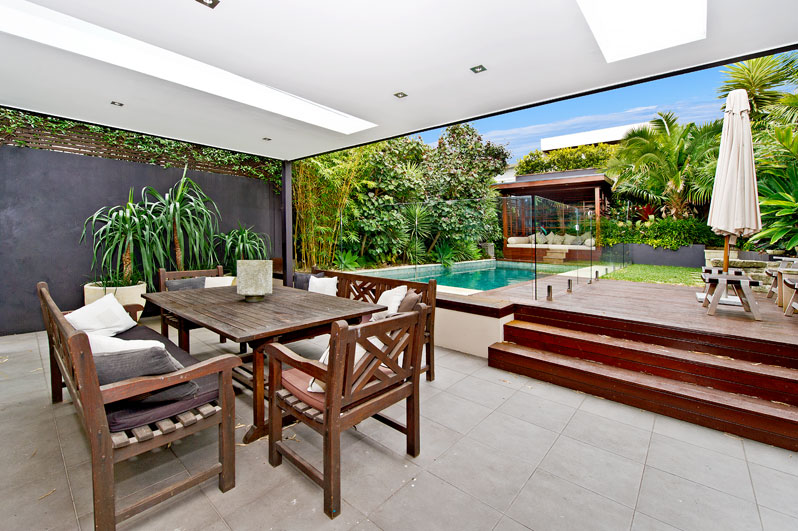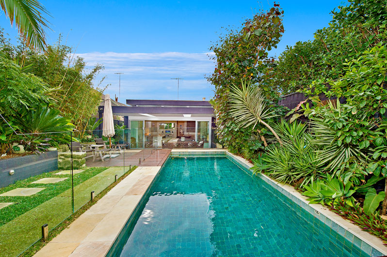 - Alfresco terrace (gas for bbq), glass-balustraded gas heated fully-tiled pool, exotic daybed, decking, sunny private tropical garden